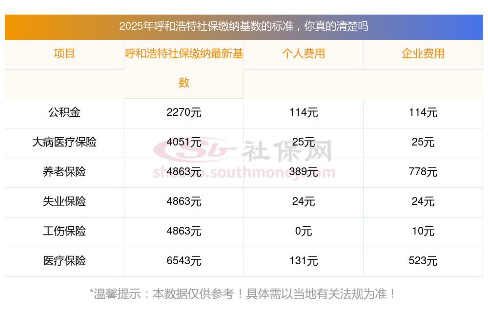 呼和浩特2025年社保养老保险缴费标准是多少?下表是2025年呼和浩特社保费用明细参考,新社通app-社保缴费查询工具提供的最新数据如下: