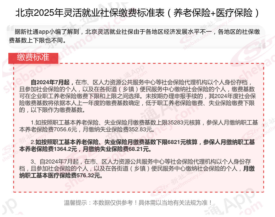 一、2025年北京灵活就业社保缴费标准表 北京灵活就业社保多少钱一个月?