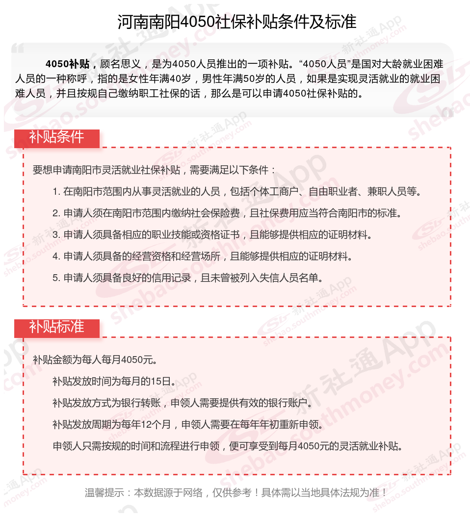 二、2025年河南南阳4050社保补贴标准及条件,最新如下: