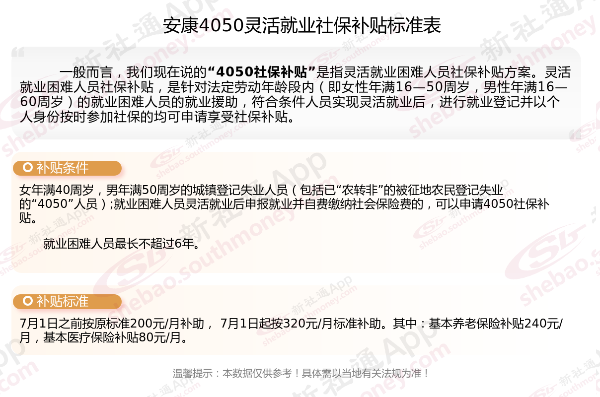 今天聊一下4050补贴的相关内容。4050补贴听起来像是一个针对特定年龄人群的社保补贴。比如女性需年满40周岁,男性需年满50周岁(以申请当年12月31日为截止日期)。那么安康4050灵活就业困难人员社保补贴多少钱?安康4050社保补贴可以申请吗?接下来随新社通APP小编具体了解一下4050社保补贴内容。