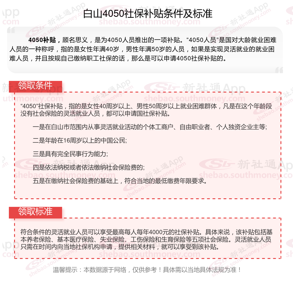 白山4050灵活就业社保补贴是什么?今天聊一下4050补贴话题。4050补贴听起来像是一个针对特定年龄人群的社保补贴。比如女性需年满40周岁,男性需年满50周岁(以申请当年12月31日为截止日期)。那么白山4050灵活就业社保补贴标准是多少钱?白山4050社保补贴可以领取多少?接下来随新社通APP小编了解一下白山4050灵活就业社保补贴的最新资讯。