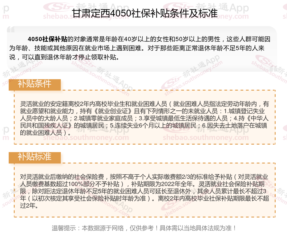 一、2025年甘肃定西4050社保补贴新规2025年甘肃定西4050社保补贴标准是什么,需要什么条件?