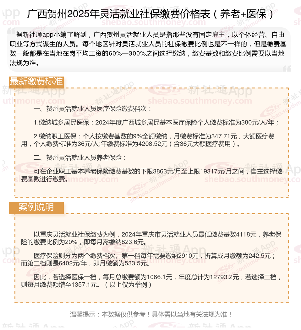 灵活就业社保缴费法规继续完善,涵盖了养老保险、医疗保险、失业保险等多个方面,旨在为灵活就业人员提供全面的社会保证。接下来随社保君了解一下2025年广西贺州灵活就业人员社保交多少钱的详细内容。