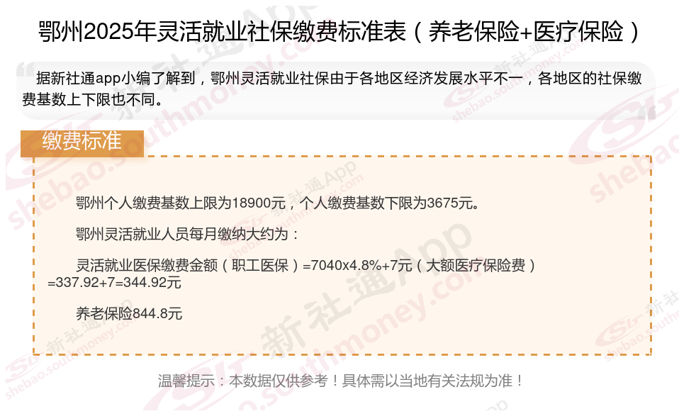 据新社通app数据显示,鄂州灵活就业养老保险缴费基数2024-2025年最新标准如下: