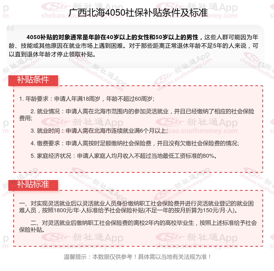2025广西北海4050补贴主要针对的是年龄在40岁以上的女性和50岁以上的男性,这些人群通常因为年龄较大而面临就业困难。