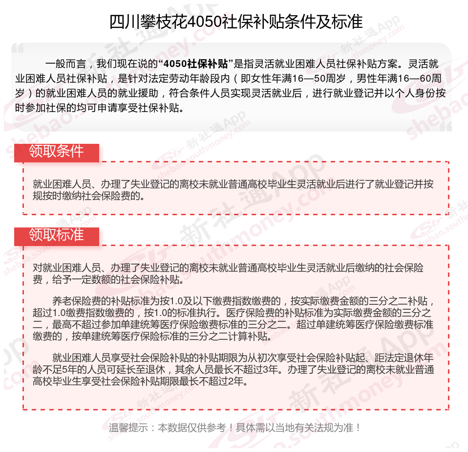 二、2025年四川攀枝花4050社保补贴标准及条件,最新如下: