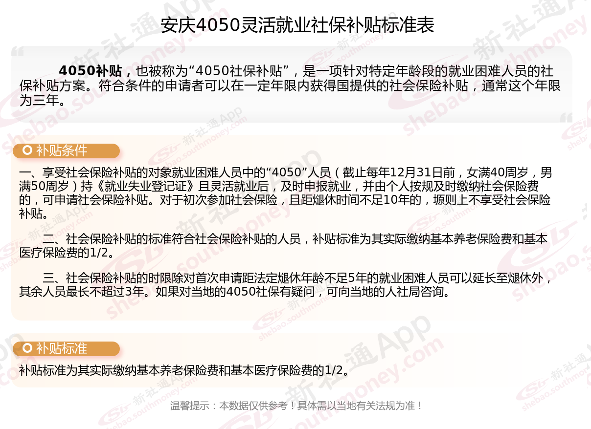 三、安庆灵活就业4050社保补贴标准及条件是什么