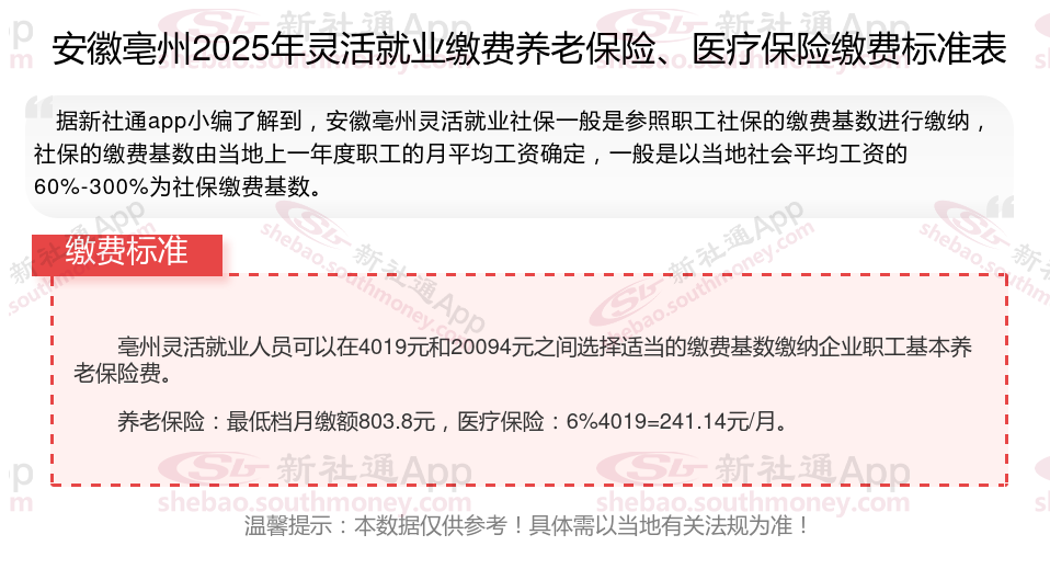 灵活就业社保是指针对灵活就业人员的社会保险制。灵活就业人员包括个体经营者、自由职业者、临时工等,他们没有固定的雇主,因此需要自行缴纳社会保险。那么2025年安徽亳州灵活就业人员社保需要交多少钱?下面随新社通小编一起来看看。