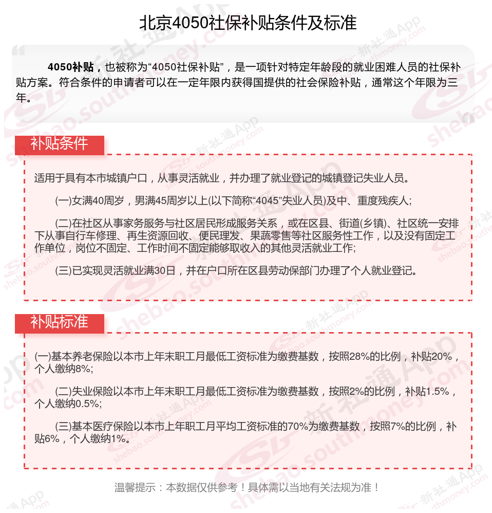 二、2025年北京4050社保补贴标准及条件,最新如下:
