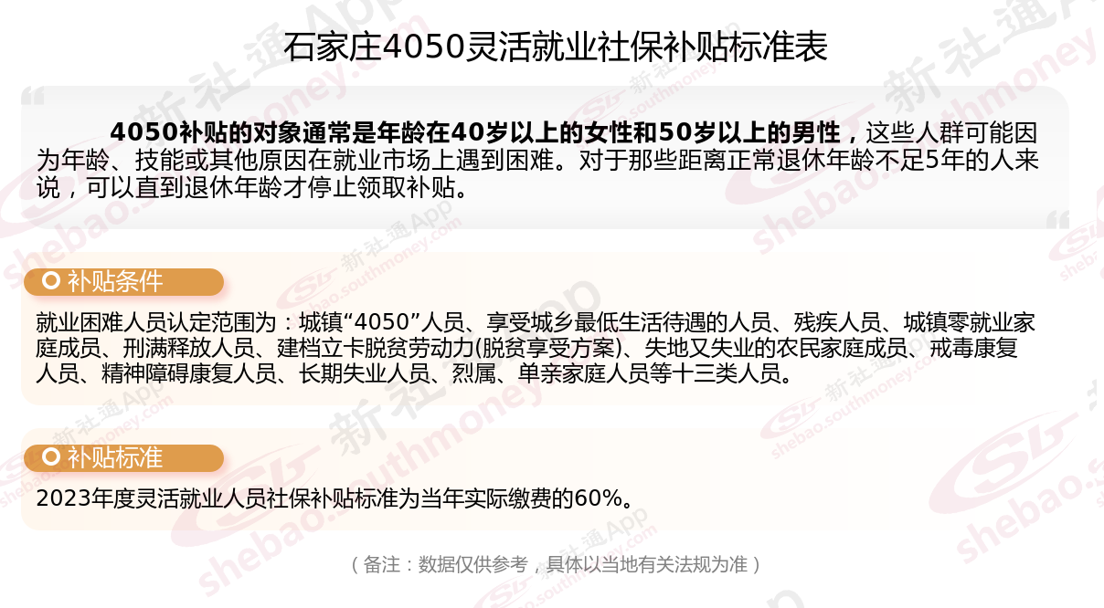 今天聊一下4050补贴的相关内容。4050补贴听起来像是一个针对特定年龄人群的社保补贴。比如女性需年满40周岁,男性需年满50周岁(以申请当年12月31日为截止日期)。那么石家庄4050灵活就业困难人员社保补贴多少钱?石家庄4050社保补贴可以申请吗?接下来随新社通APP小编具体了解一下4050社保补贴内容。