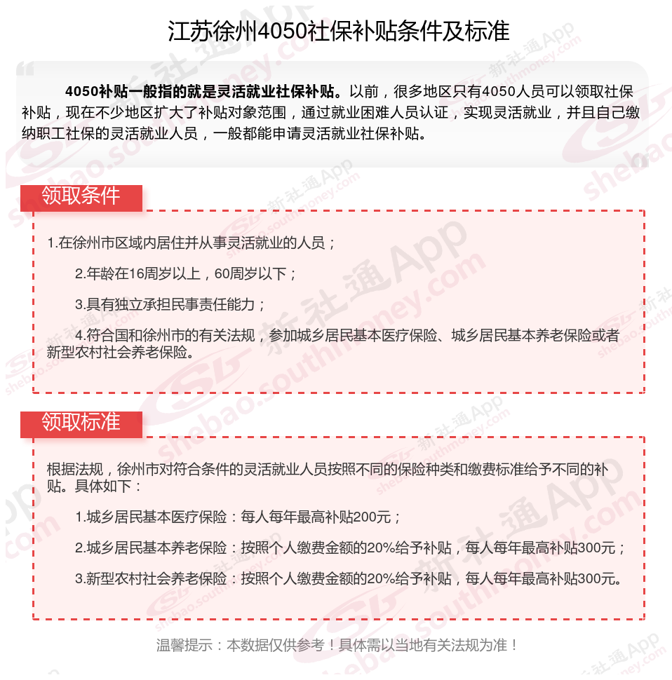 二、2025年江苏徐州4050社保补贴标准及条件,最新如下: