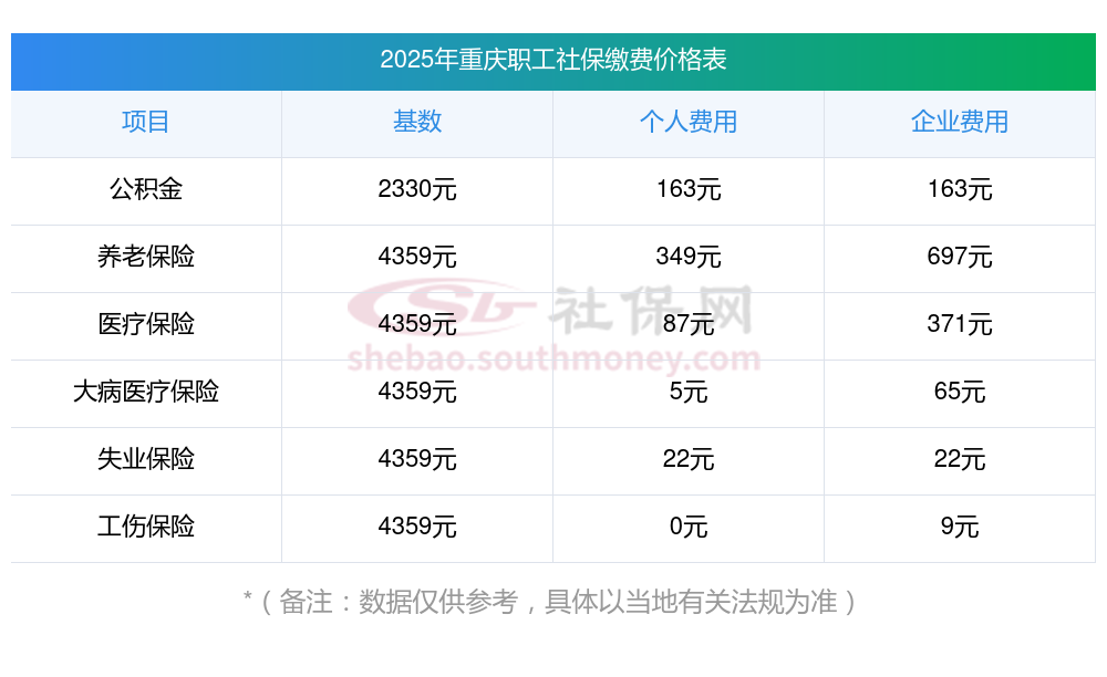 2025年重庆社保缴费价格,2025年重庆社保缴费多少钱?下表是2025年重庆社保费用明细参考,新社通app-社保缴费查询工具提供的最新数据如下: