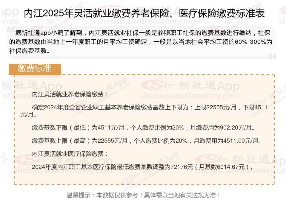 据新社通app数据显示,内江灵活就业养老保险缴费基数2024-2025年最新标准如下: