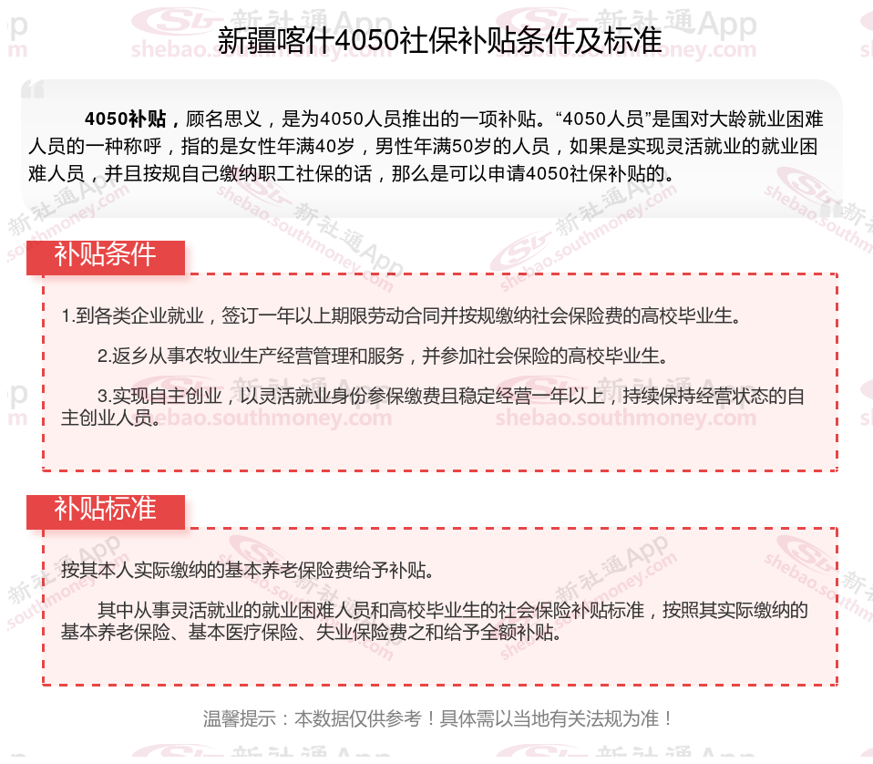 4050补贴主要是针对大龄就业困难人群的社保补贴,申请条件包括年龄、就业困难、灵活就业并自费缴纳社保,需要持有失业登记证,不同地区可能有细微差别,比如农村户口的限制。那么新疆喀什4050灵活就业社保补贴标准是多少钱?新疆喀什4050社保补贴条件是什么?接下来随新社通APP小编了解一下最新资讯。