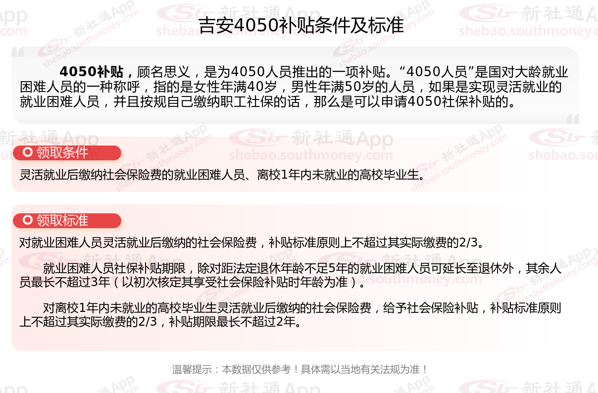 一、吉安4050社保补贴标准及条件2025年最新消息