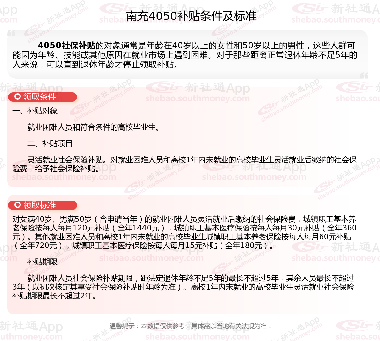 4050补贴主要是针对大龄就业困难人群的社保补贴,申请条件包括年龄、就业困难、灵活就业并自费缴纳社保,需要持有失业登记证,不同地区可能有细微差别,比如农村户口的限制。那么南充4050灵活就业社保补贴标准是多少钱?南充4050社保补贴条件是什么?接下来随新社通APP小编了解一下最新资讯。