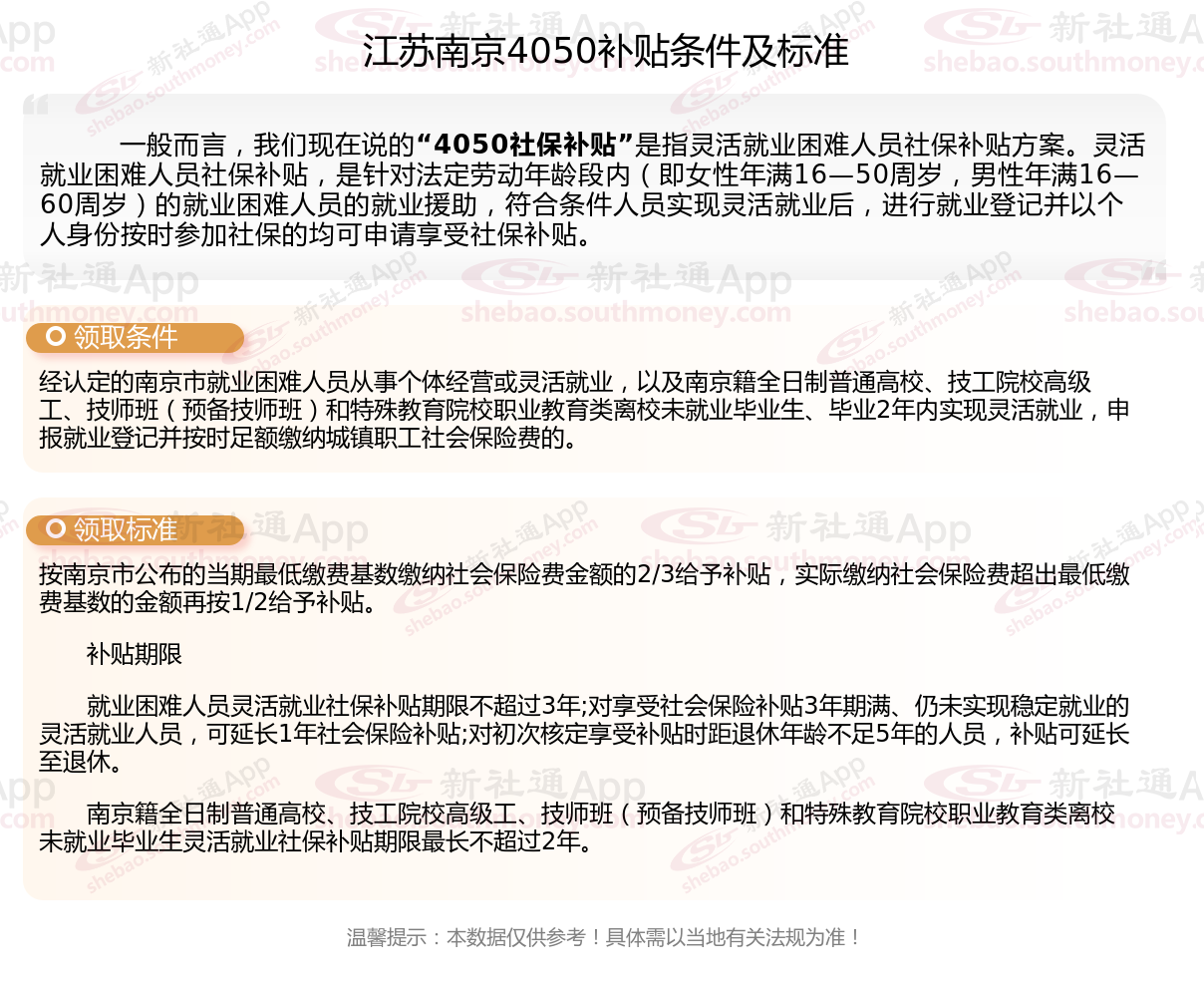 一、2023-2024年江苏南京4050社保补贴标准及条件是多少?