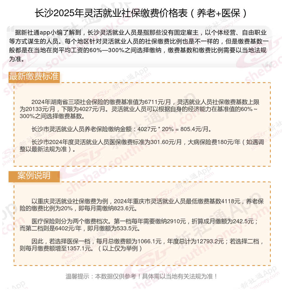 据新社通app数据显示,长沙灵活就业养老保险缴费基数2024-2025年最新标准如下: