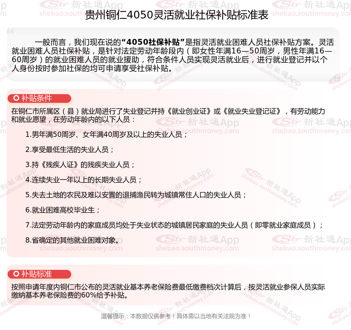 二、2025年贵州铜仁4050社保补贴标准及条件,最新如下: