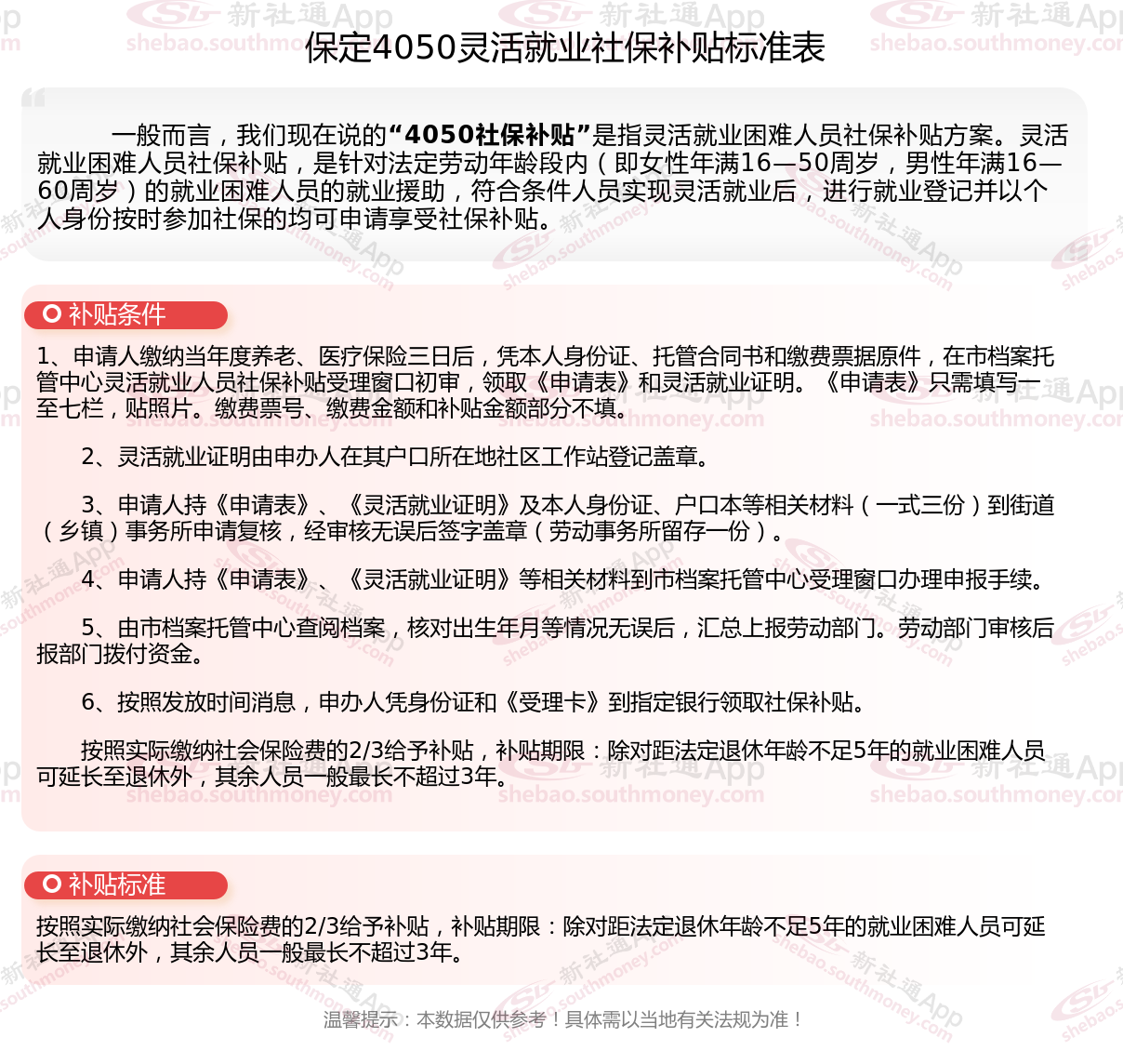 2025保定灵活就业4050社保补贴是一项面向特定年龄段的就业困难人群的社会保险补贴。