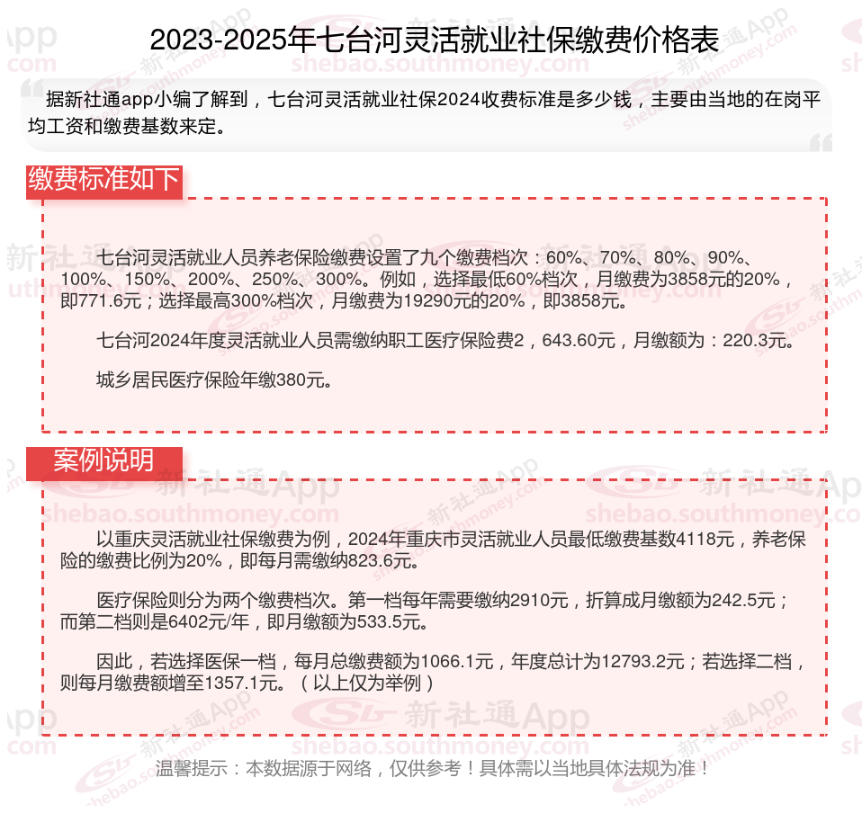 那么,自由职业者社保是多少钱一个月 七台河灵活社保交多少钱?根据新社通app-社保缴费查询工具提供的2025社保缴费标准详情数据: