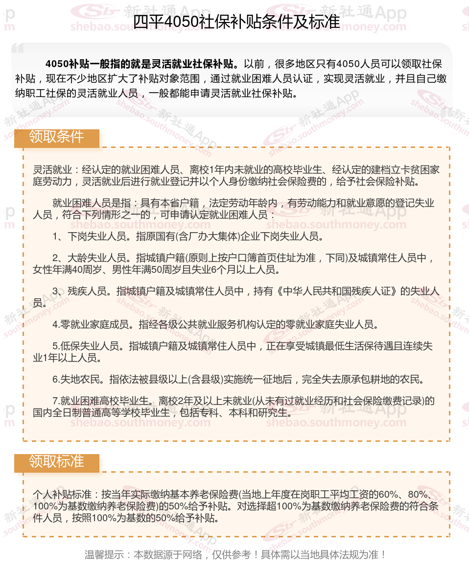 2025四平4050补贴主要针对的是年龄在40岁以上的女性和50岁以上的男性,这些人群通常因为年龄较大而面临就业困难。
