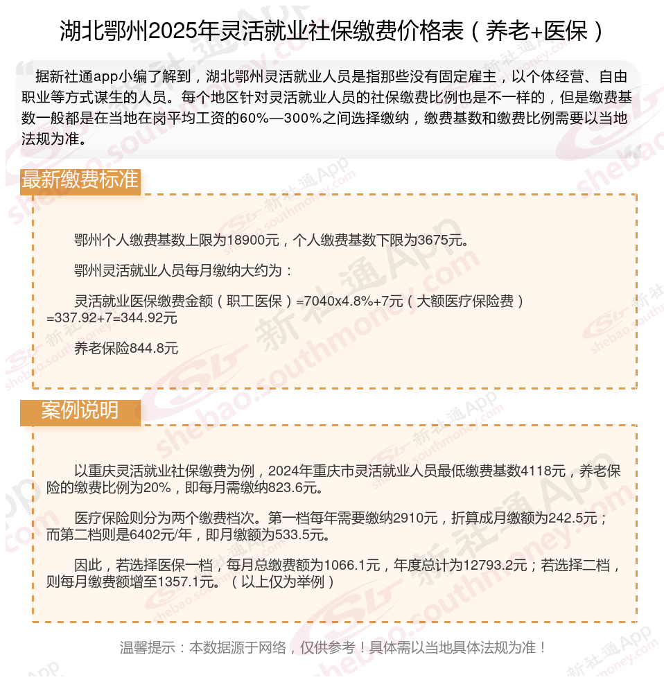 据新社通app数据显示,湖北鄂州灵活就业人员养老保险缴费基数2024-2025年最新标准如下: