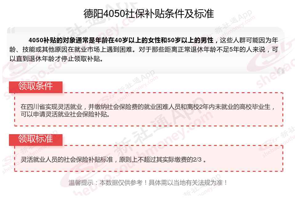 德阳4050社保补贴多少钱一个月?德阳4050社保补贴2025年最新标准是多少?2025德阳4050补贴主要针对的是年龄在40岁以上的女性和50岁以上的男性,这些人群通常因为年龄较大而面临就业困难。