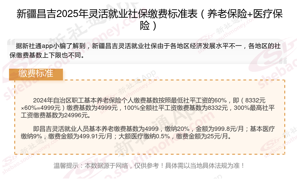 据新社通app数据显示,新疆昌吉灵活就业养老保险缴费基数2024-2025年最新标准如下: