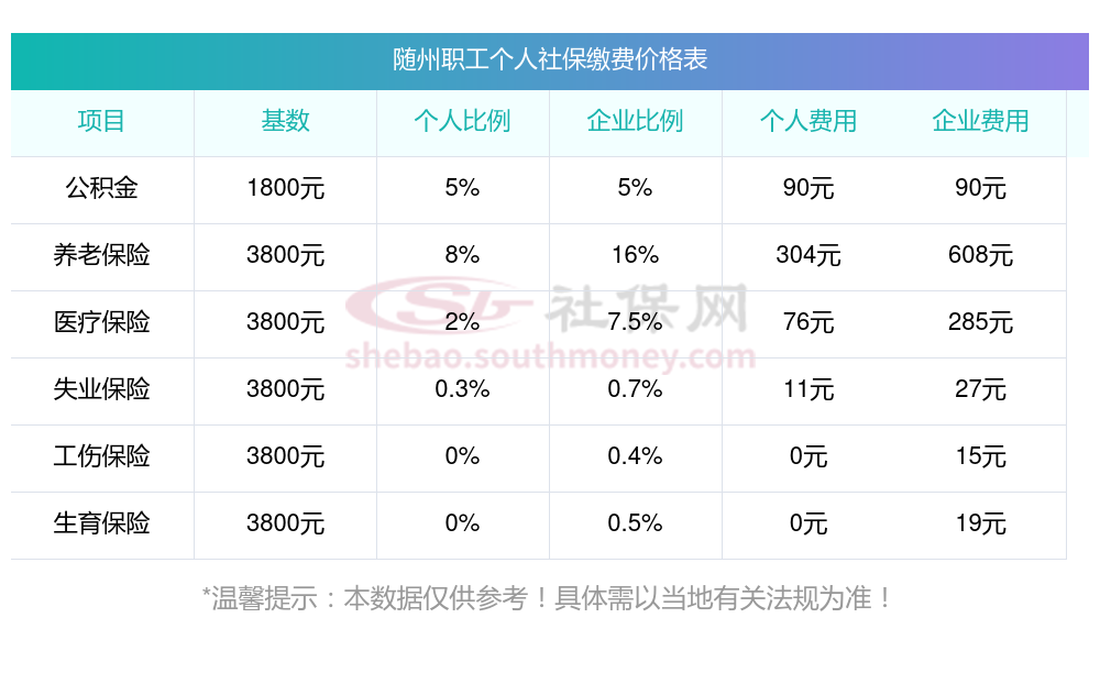 2025年随州社保缴费最低基数及个人和单位具体是多少钱?下表是2025年随州社保费用明细参考,新社通app-社保缴费查询工具提供的最新数据如下: