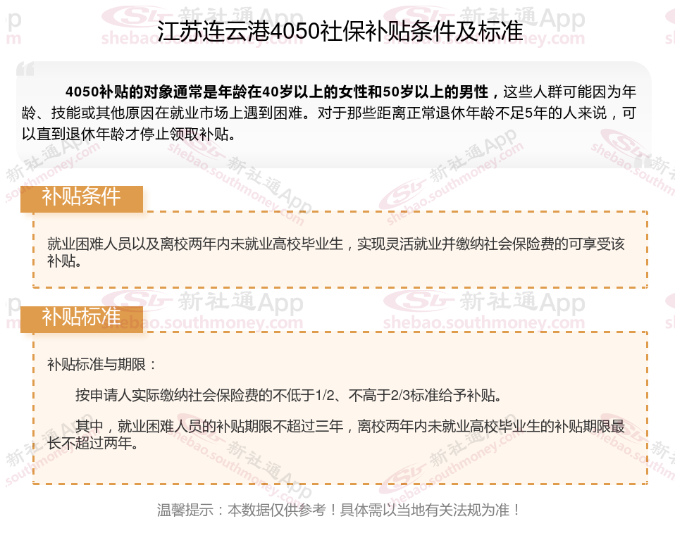 2025江苏连云港4050补贴主要针对的是年龄在40岁以上的女性和50岁以上的男性,这些人群通常因为年龄较大而面临就业困难。