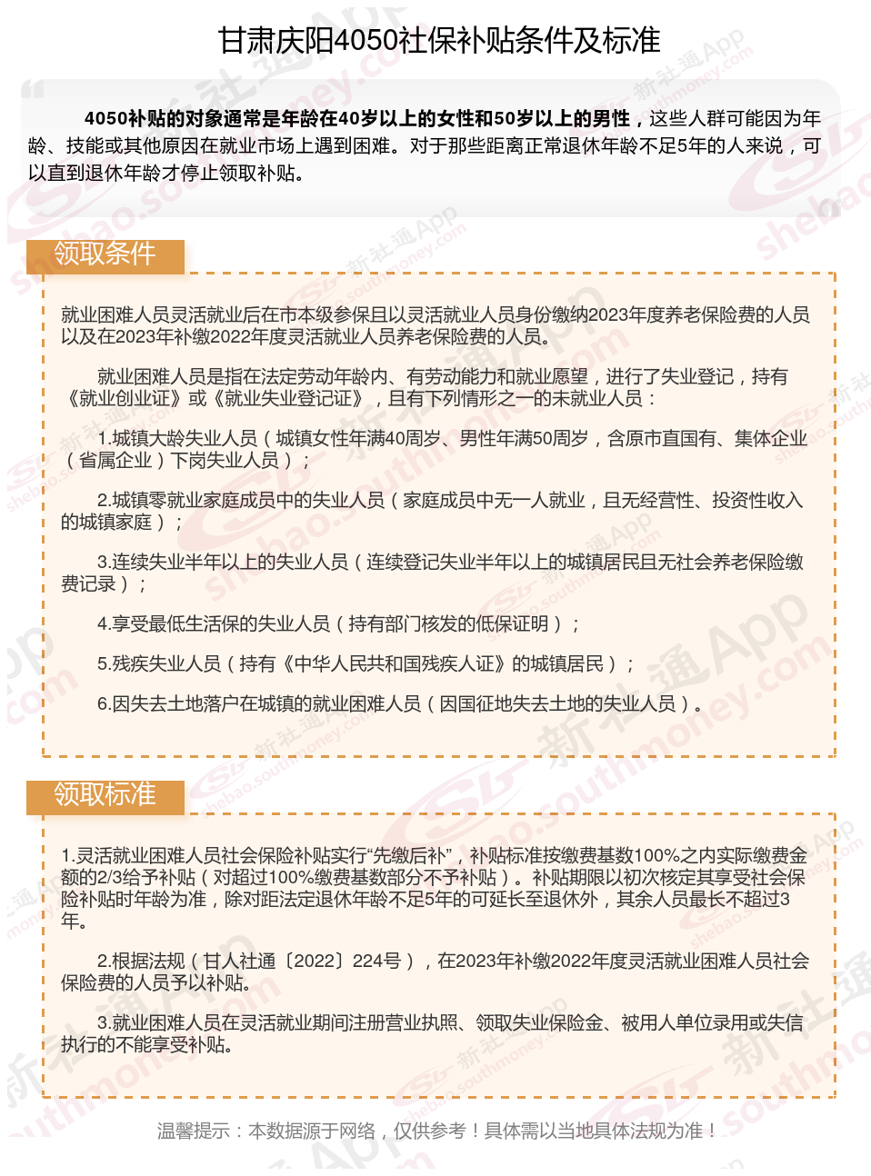 一、2025年甘肃庆阳4050社保补贴标准是怎么样的,附领取条件