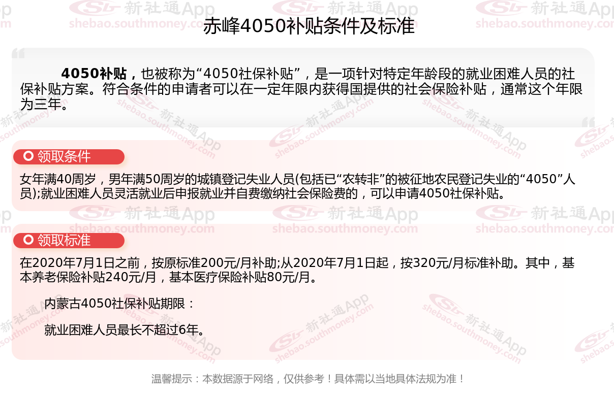 一、2023-2024年赤峰4050社保补贴标准及条件是多少?