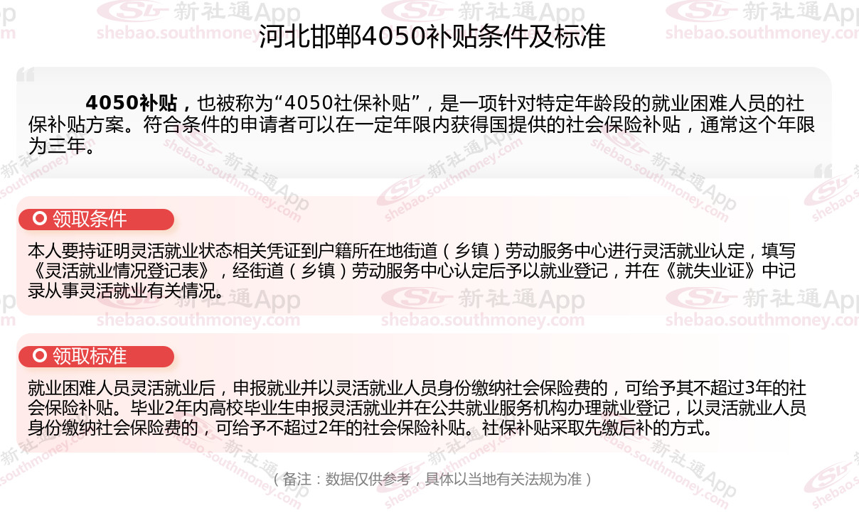 “灵活就业4050社保补贴”需要以灵活就业身份参加职工养老和医疗保险,补贴标准不超过实际缴费的三分之二,最长3年,距离退休不足5年的可延长到退休。补贴对象包括国企下岗人员、低保家庭等。申请流程需要提交身份证、银行账户等。那么河北邯郸4050灵活就业困难人员社保补贴标准是多少?河北邯郸4050社保补贴需要符合什么条件?接下来随新社通APP小编具体了解一下4050社保补贴内容。