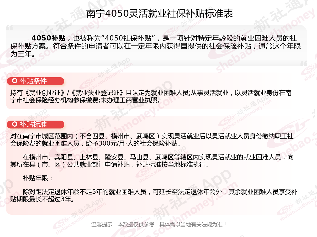 二、2025年南宁4050社保补贴标准及条件,最新如下: