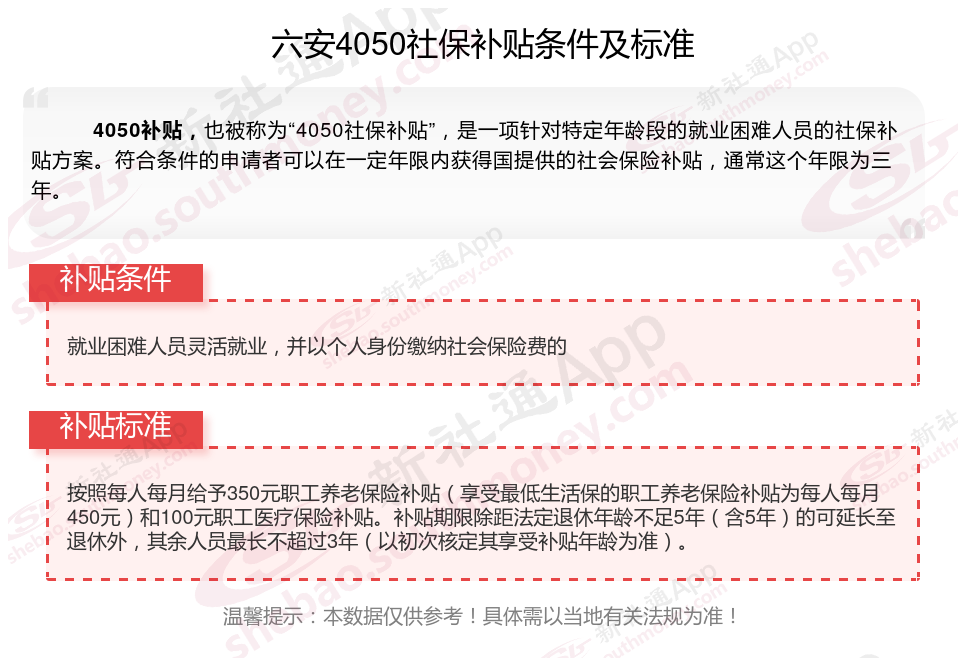 一、2025年六安灵活就业4050社保补贴标准及条件是什么