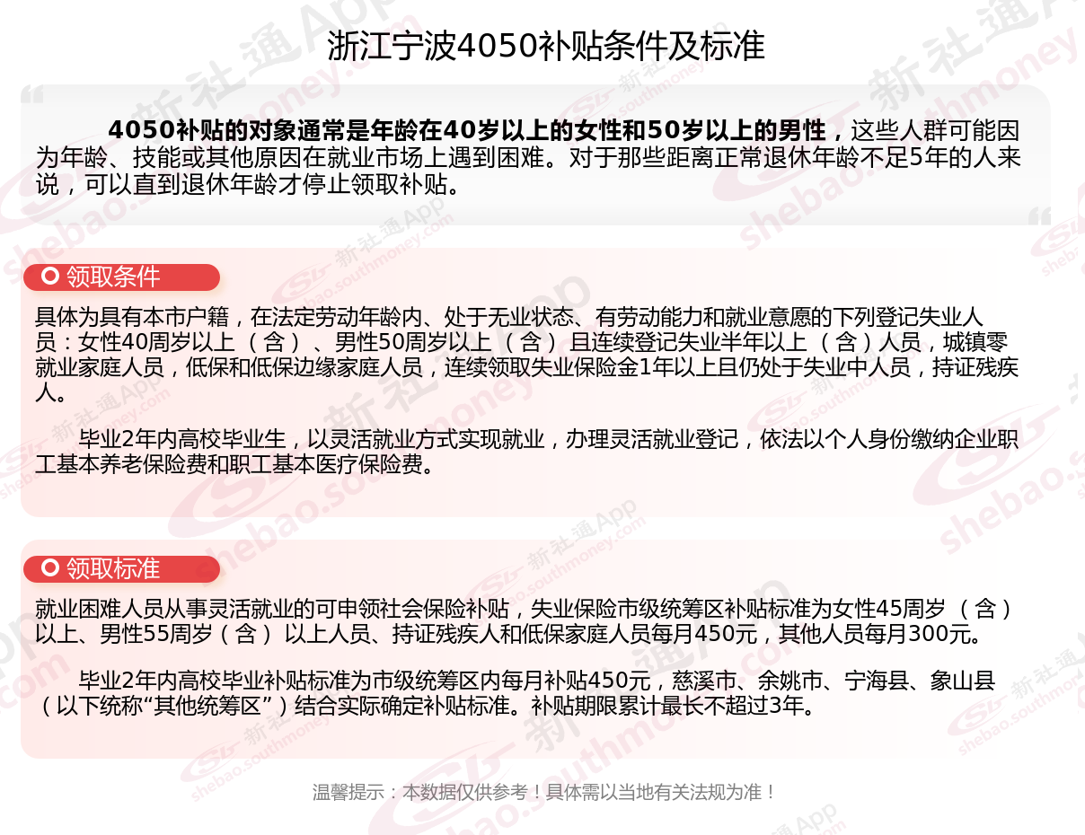 2025浙江宁波4050补贴主要针对的是年龄在40岁以上的女性和50岁以上的男性,这些人群通常因为年龄较大而面临就业困难。