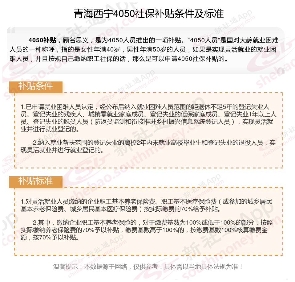 一、青海西宁4050社保补贴标准及条件2025年最新消息