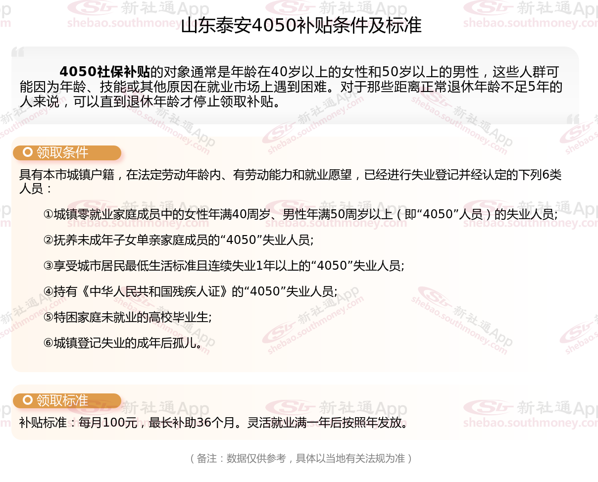 2025山东泰安4050补贴主要针对的是年龄在40岁以上的女性和50岁以上的男性,这些人群通常因为年龄较大而面临就业困难。