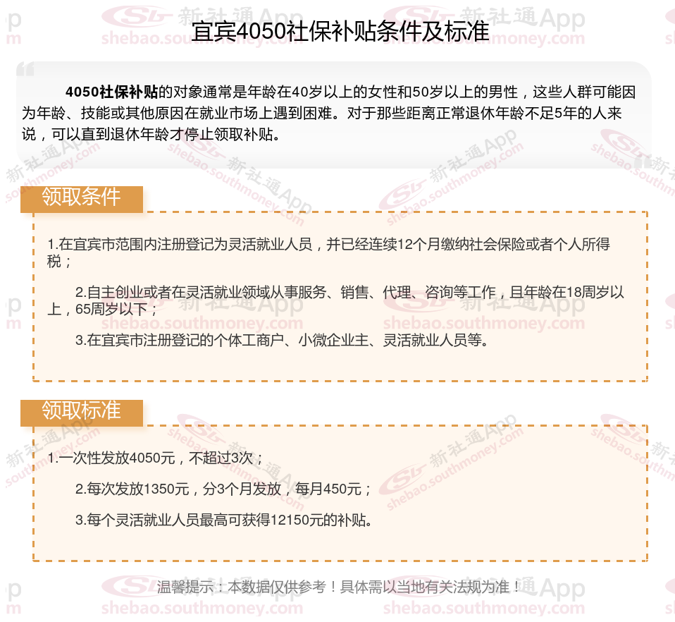 宜宾4050社保补贴多少钱一个月?宜宾4050社保补贴2025年最新标准是多少?2025宜宾4050补贴主要针对的是年龄在40岁以上的女性和50岁以上的男性,这些人群通常因为年龄较大而面临就业困难。