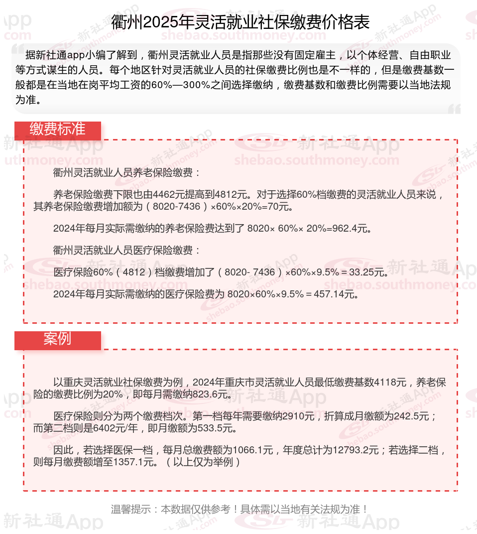 据新社通app数据显示,衢州灵活就业人员养老保险缴费基数2024-2025年最新标准如下: