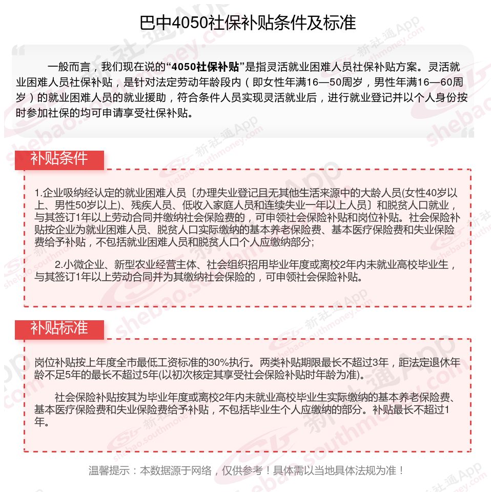 二、2025年巴中4050社保补贴标准及条件,最新如下: