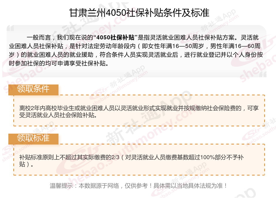 二、甘肃兰州灵活就业4050社保补贴标准及条件是什么