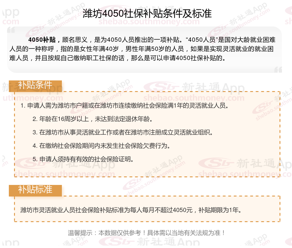 一、2023-2024年潍坊4050社保补贴标准及条件是多少?