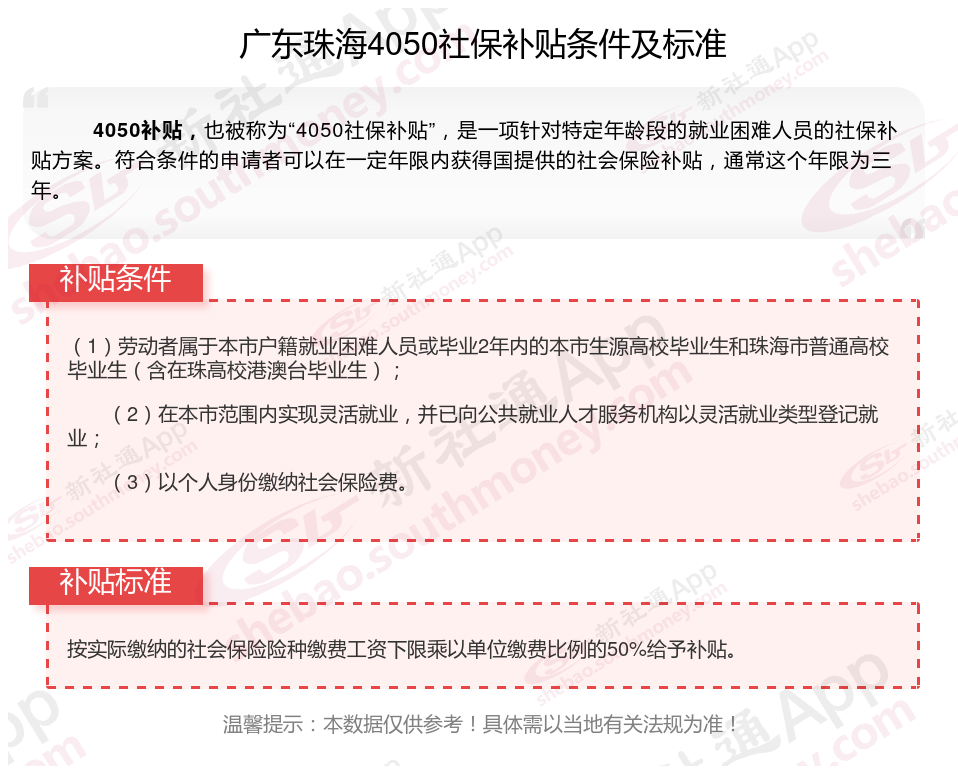 一、广东珠海4050社保补贴标准及条件2025年最新消息