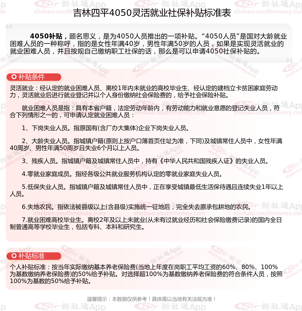 一、2025年吉林四平4050社保补贴标准及条件是多少?