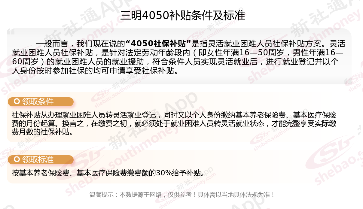 “灵活就业4050社保补贴”是指灵活就业困难人员社保补贴。该方案是对就业困难人员灵活就业后办理了就业登记手续并参加社会保险的,给予社会保险补贴。那么三明4050灵活就业困难人员社保补贴标准是多少?三明4050社保补贴需要符合什么条件?接下来随新社通APP小编了解一下最新资讯。