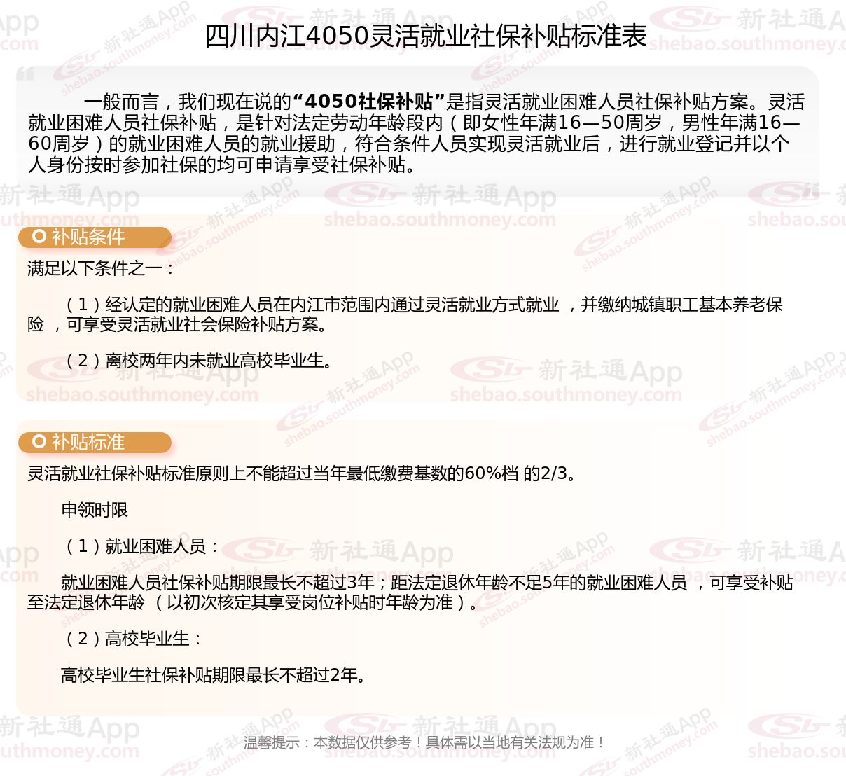 二、2025年四川内江4050社保补贴标准及条件,最新如下: