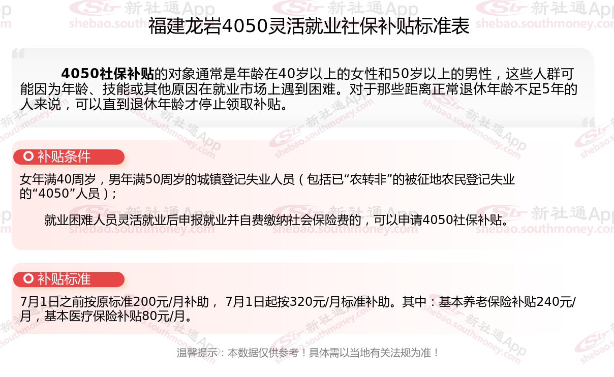 一、福建龙岩4050社保补贴标准是什么?附条件