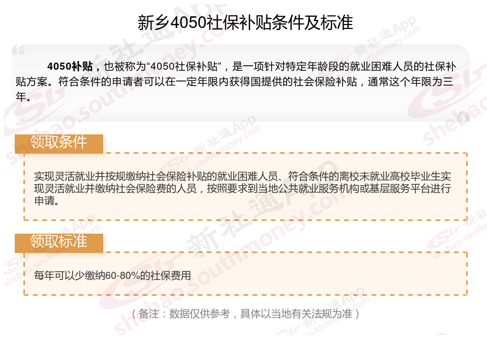 一、2023-2024年新乡4050社保补贴标准及条件是多少?